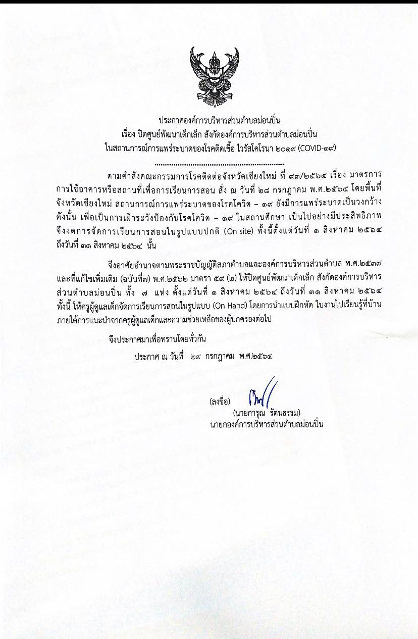 NEW ประกาศปิดศูนย์พัฒนาเด็กเล็ก สังกัดองค์การบริหารสว่นตำบลม่อนปิ่น ในสถานการณ์การแพร่ระบาดของโรคติดเชื้อ ไวรัสโคโรนา 2019 (COVID - 19) ประกาศปิดศูนย์พัฒนาเด็กเล็ก สังกัดองค์การบริหารสว่นตำบลม่อนปิ่น ในสถานการณ์การแพร่ระบาดของโรคติดเชื้อ ไวรัสโคโรนา 2019 (COVID - 19) ให้ครูผู้ดูแลเด็กจัดการเรียนการสอนในรูปแบบ (On Hand) โดยการนำแบบฝึกหัด ใบงานไปเรียนรู้ที่บ้าน ภายใต้การแนะนำจากครูผู้ดูแลเด็กและความช่วยเหลือของผู้ปกครอง