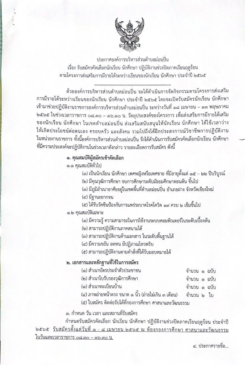 NEW รับสมัครคัดเลือกนักเรียน นักศึกษา ปฏิบัติงานช่วงปิดภาคเรียนฤดูร้อน ประจำปี พ.ศ.2565 องค์การบริหารส่วนตำบลม่อนปิ่น เปิดรับสมัครคัดเลือกนักเรียน นักศึกษา ปฏิบัติงานช่วงปิดภาคเรียนฤดูร้อน ประจำปี พ.ศ.2565 ส่งเอกสารสมัครได้ตั้งแต่วันที่ 1 - 8 เมษายน 2565 ในวันและเวลาราชการ ณ ห้องกองการศึกษา ศาสนาและวัฒนธรรม