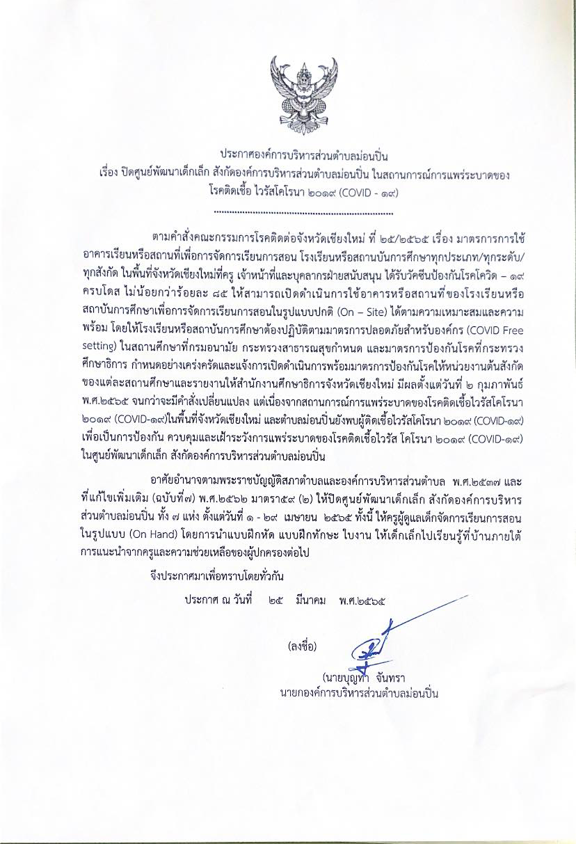 NEW ปิดศูนย์พัฒนาเด็กเล็ก สังกัดองค์การบริหารส่วนตำบลม่อนปิ่น ในสถานการณ์การแพร่ระบาดของโรคติดเชื้อ ไวรัสโคโรนา ๒๐๑๙ (COVID - ๑๙) ปิดศูนย์พัฒนาเด็กเล็ก สังกัดองค์การบริหารส่วนตำบลม่อนปิ่น ในสถานการณ์การแพร่ระบาดของโรคติดเชื้อ ไวรัสโคโรนา ๒๐๑๙ (COVID - ๑๙)