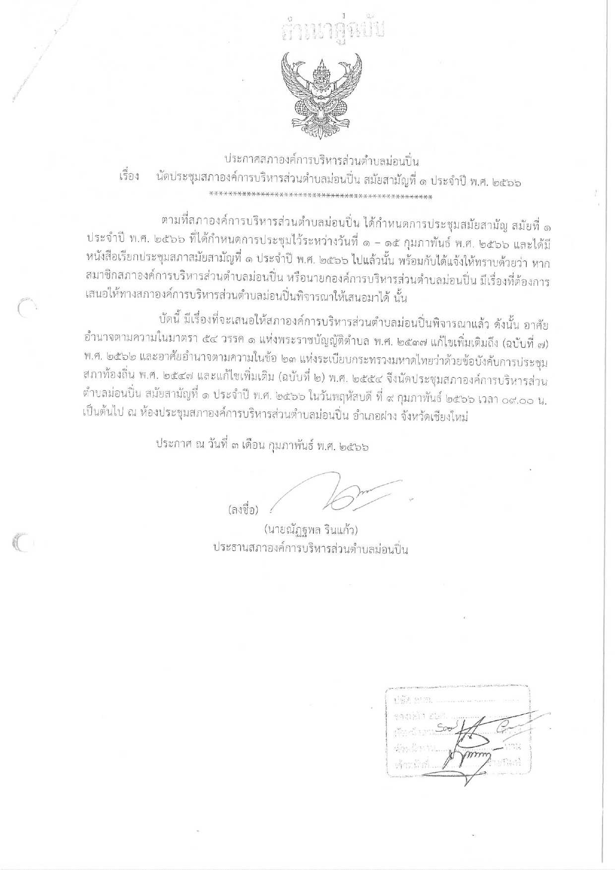 เรียกประชุมสภาองค์การบริหารส่วนตำบลม่อนปิ่น สมัยสามัญที่ ๑ ประจำปี พ.ศ. ๒๕๖๖