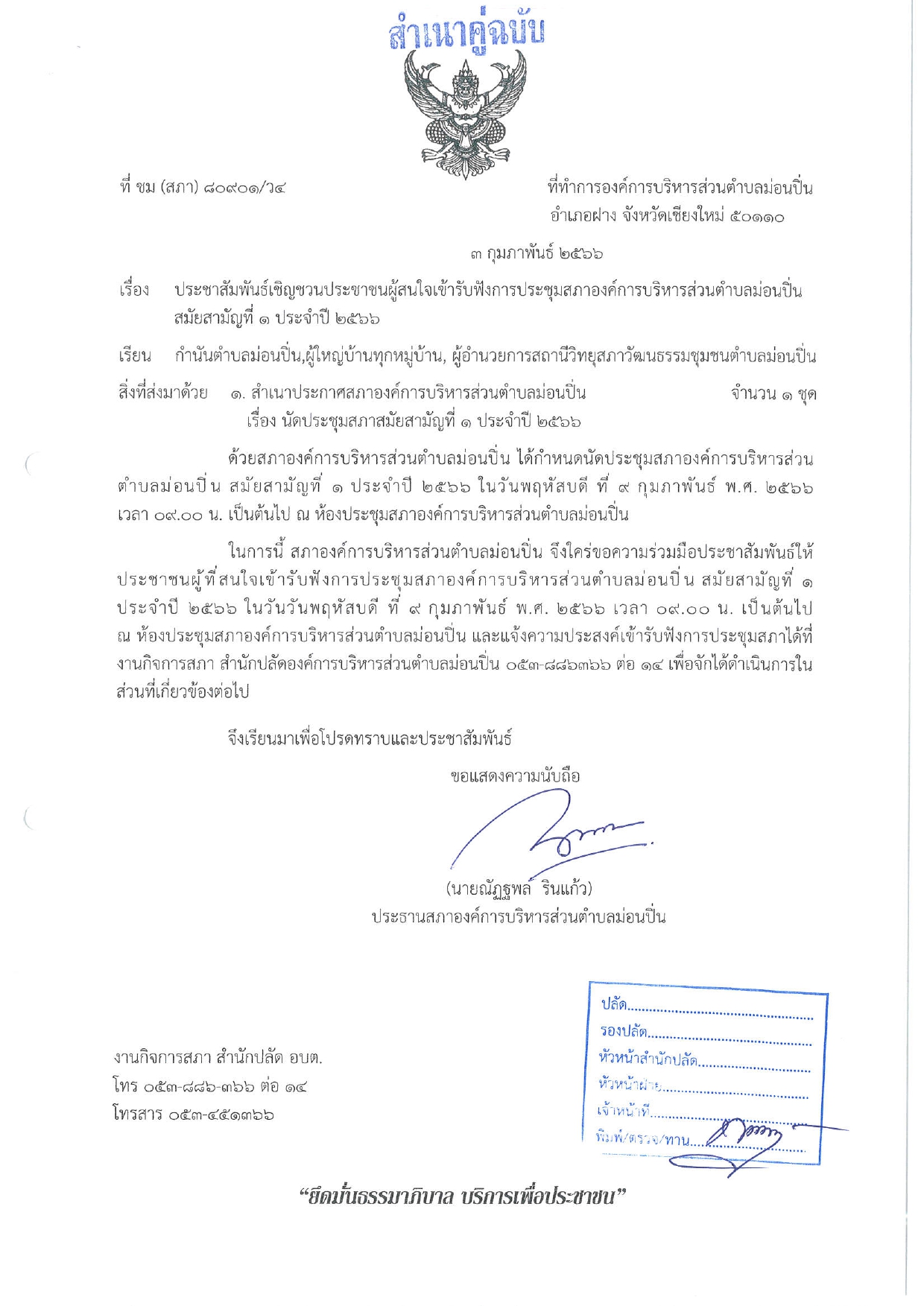 ประชาสัมพันธ์เชิญชวนประชาชนผู้สนใจเข้ารับฟังการประชุมสภาองค์การบริหารส่วนตำบลม่อนปิ่น สมัยสามัญที่ ๑ ประจำปี ๒๕๖๖