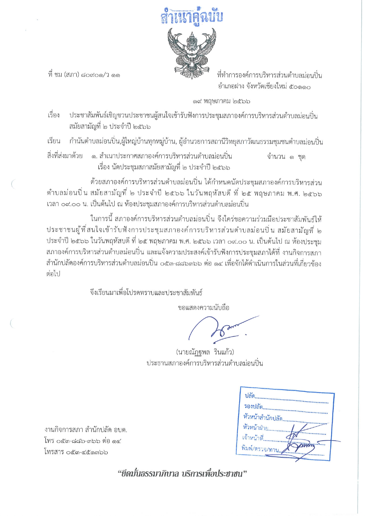 ประชาสัมพันธ์เชิญชวนประชาชนผู้สนใจเข้ารับฟังการประชุมสภาองค์การบริหารส่วนตำบลม่อนปิ่น สมัยสามัญที่ ๒ ประจำปี ๒๕๖๖