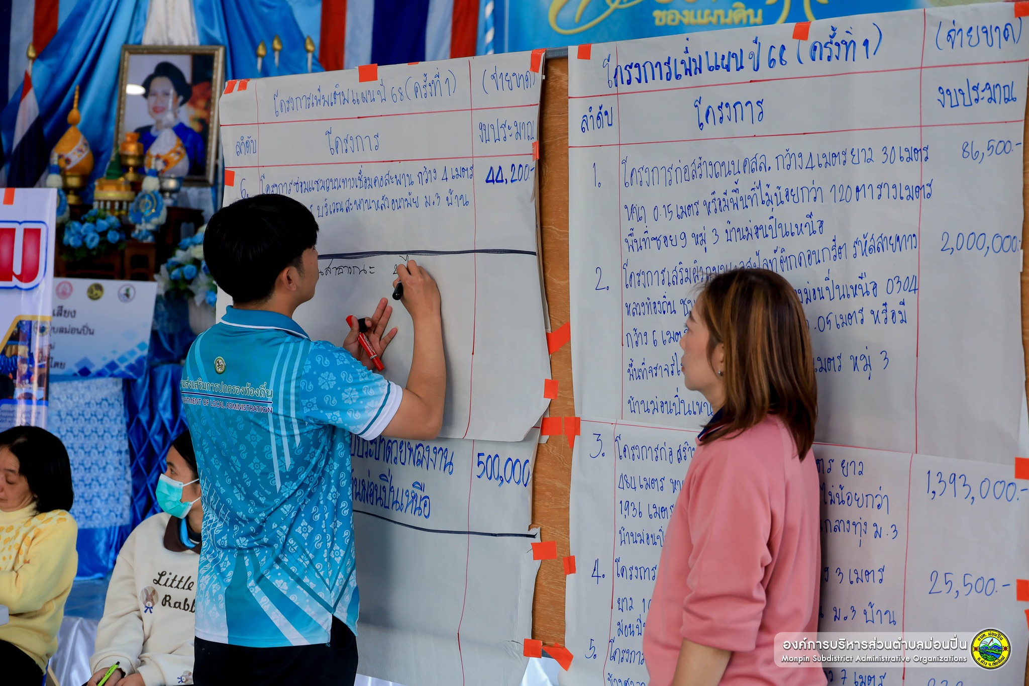 นายบุญทา จันทรา นายกองค์การบริหารส่วนตำบลม่อนปิ่น นางอารีย์ สุริยะ รองนายกฯ นายศิรภพ สุจาคำ รองนายกฯ พร้อมด้วย สมาชิกสภาฯ พนักงานฯ เจ้าหน้าที่ฯ และ ฝ่ายปกครองตำบลม่อนปิ่น จัดเวทีประชาคมเพื่อปรับปรุง ทบทวน เพิ่มเติม แก้ไข เปลี่ยนแปลง แผนพัฒนาท้องถิ่น (พ.ศ. 2566 - 2570)