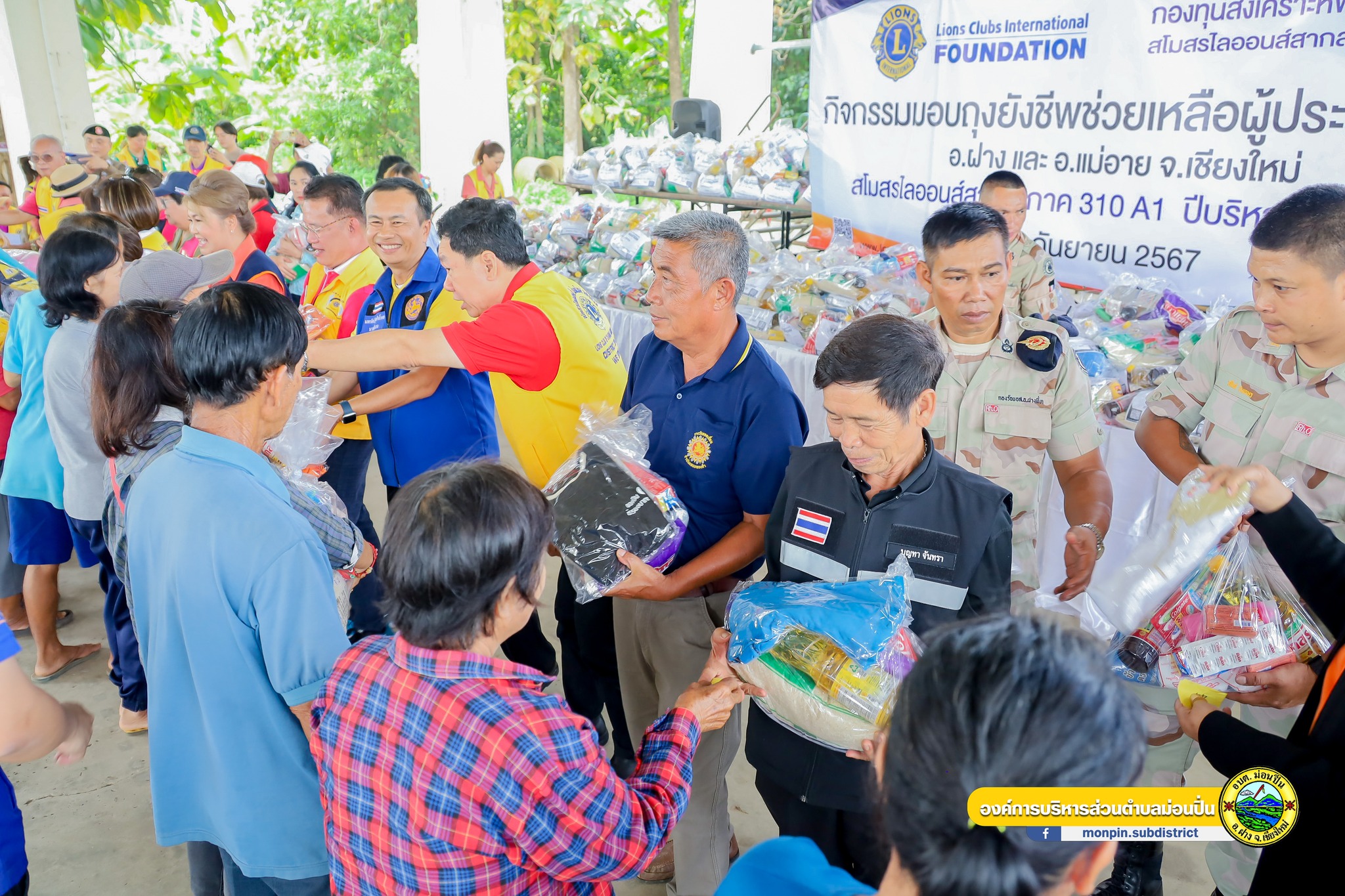 สโมสร ไลออนส์ สากล ภาค 310 A1 มอบถุงยังชีพ จำนวน 500 ชุด ให้กับผู้ประสบอุทกภัย พื้นที่ ต.ม่อนปิ่น อ.ฝาง จ.เชียงใหม่ โดยมี ว่าที่ร้อยตรีนพรัตน์ ศุภกิจโกศล นายอำเภอฝาง พร้อมด้วยนายบุญทา จันทรา นายกองค์การบริหารส่วนตำบม่อนปิ่น นายศตวรรษ อภิวงค์ ปลัดอำเภอ นายสรพงศ์ เตละวานิช ปลัดอำเภอ นายสุรินทร์ ศรีวรรณตัน กำนันตำบลม่อนปิ่น กิ่งกาชาดอำเภอฝาง แม่บ้านมหาดไทย ร่วมต้อนรับคณะพร้อมทั้งพูดคุยสร้างขวัญกำลังใจแก่ผู้ประสบภัย ณ องค์การบริหารส่วนตำบลม่อนปิ่น