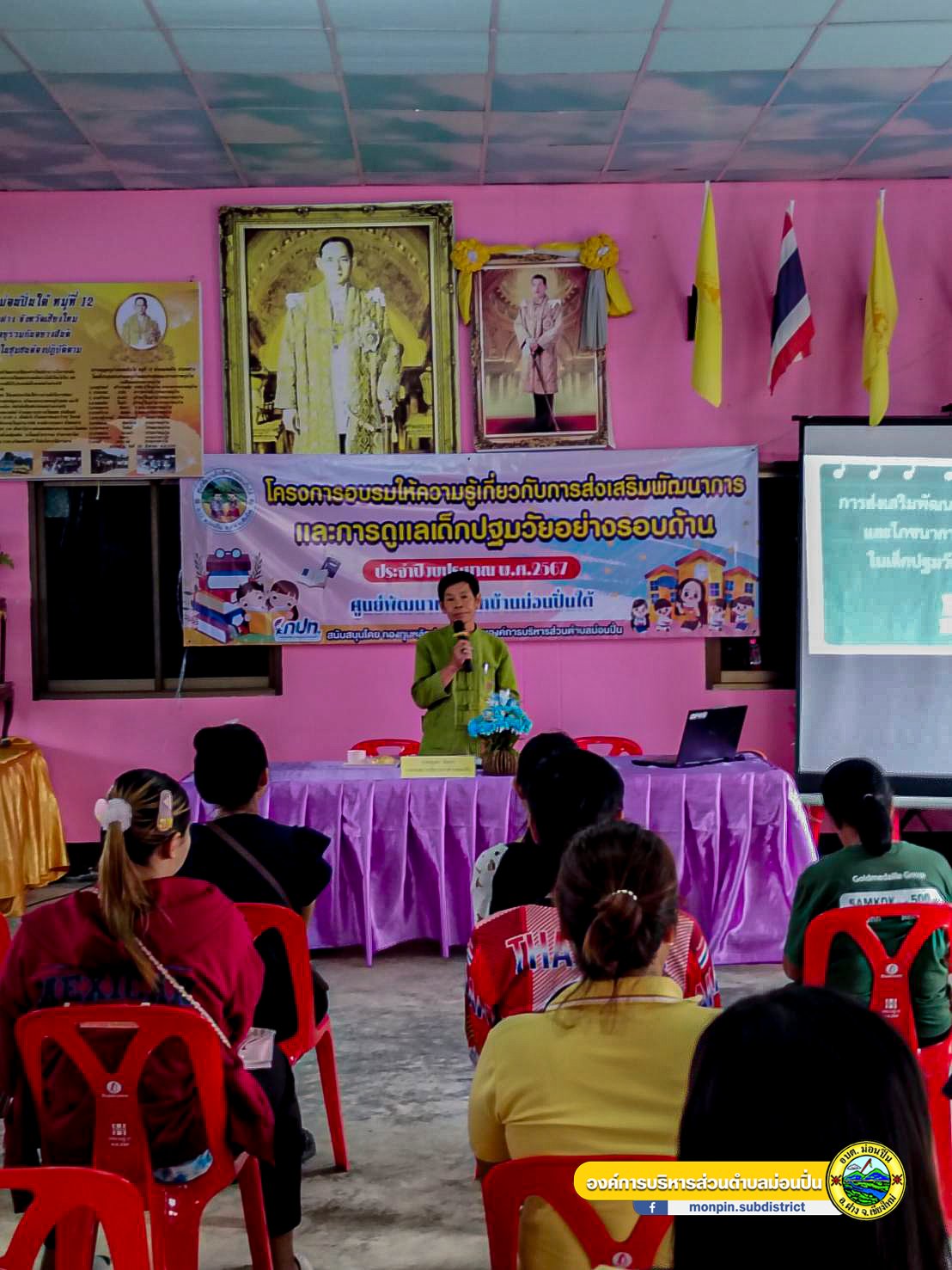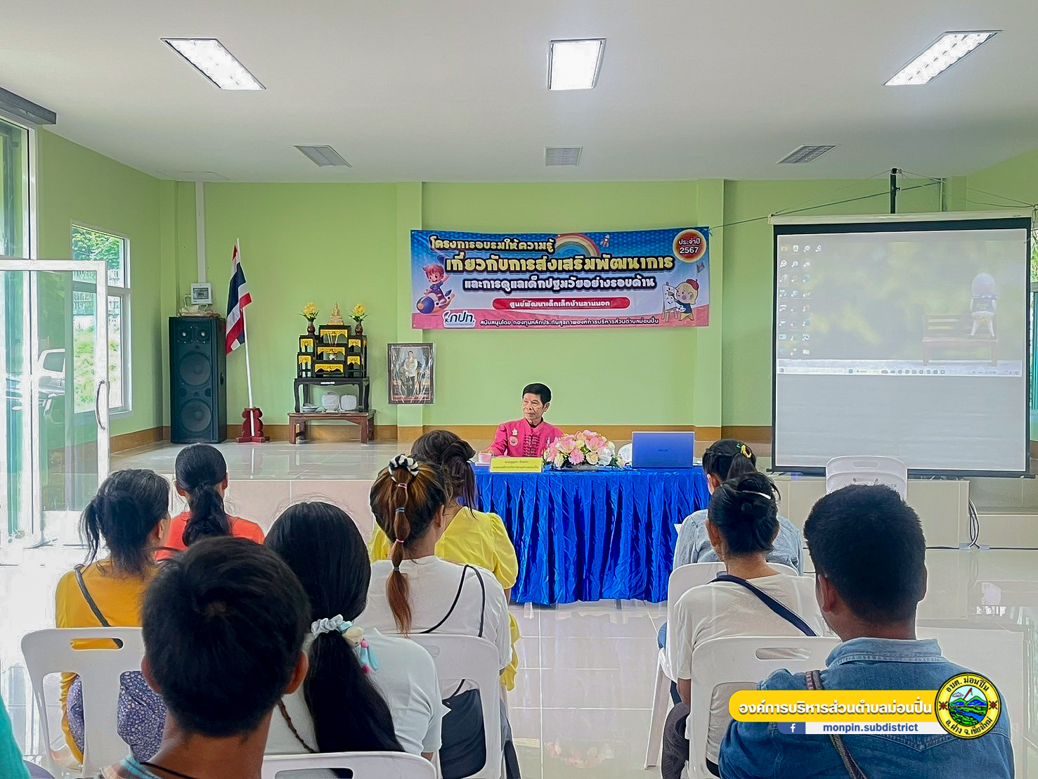 21 กันยายน 2567 นายบุญทา จันทรา นายกองค์การบริหารส่วนตำบลม่อนปิ่น เป็นประธานพิธีเปิดโครงการอบรมให้ความรู้เรื่องโรคติดต่อในเด็กก่อนวัยเรียนศูนย์พัฒนาเด็กเล็กบ้านม่อนปิ่นใต้ประจำปีงบประมาณ 2567 เพื่อให้ ครู/ผู้ดูแลเด็ก ผู้ปกครอง และผู้มีส่วนเกี่ยวของในศูนย์พัฒนาเด็กเล็ก เล็งเห็นความสำคัญและต้องการให้ความรู้เกี่ยวกับการส่งเสริมพัฒนาการและการดูแลเด็กปฐมวัยอย่างรอบด้าน ส่งเสริมพัฒนาการของเด็กปฐมวัยและปัจจัยเสี่ยงที่เด็กจะมีพัฒนาการล่าช้า การป้องกันโรคระบาดและโรคติดต่อที่พบมากในกลุ่มเด็กปฐมวัย การช่วยเหลือฟืนคืนคืนผู้ที่หยดหายใจ (CPR) เบื้องต้น รวมทั้งสามารถให้การช่วยเหลือเบื้องต้นหากเกิดอุบัติเหตุขึ้นกับเด็กปฐมวัยหรือบุคคลทั่วไปที่ประสบเหตุได้  ณ ศูนย์พัฒนาเด็กเล็กบ้านม่อนปิ่นใต้ หมู่ที่ 12 ต.ม่อนปิ่น อ.ฝาง จ.เชียงใหม่