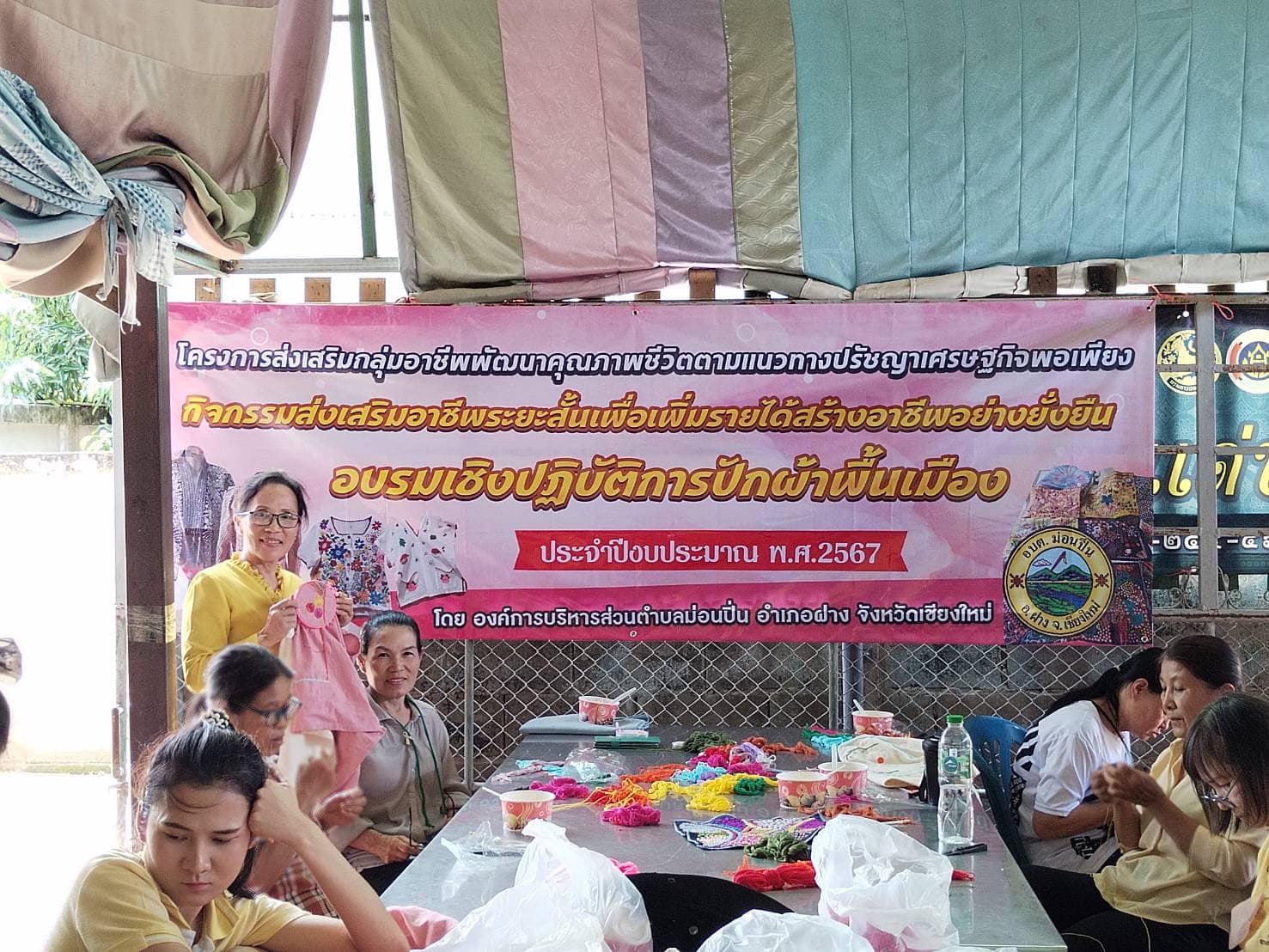 โครงการส่งเสริมกลุ่มอาชีพพัฒนาคุณภาพชีวิตตามแนวทางปรัชญาเศรษฐกิจพอเพียง กิจกรรมส่งเสริมอาชีพระยะสั้นเพื่อเพิ่มรายได้สร้างอาชีพอย่างยั่งยืน ประจำปีงบประมาณ พ.ศ.2567 โดยมีการจัดอบรมเชิงปฏิบัติการปักผ้าพื้นมือง