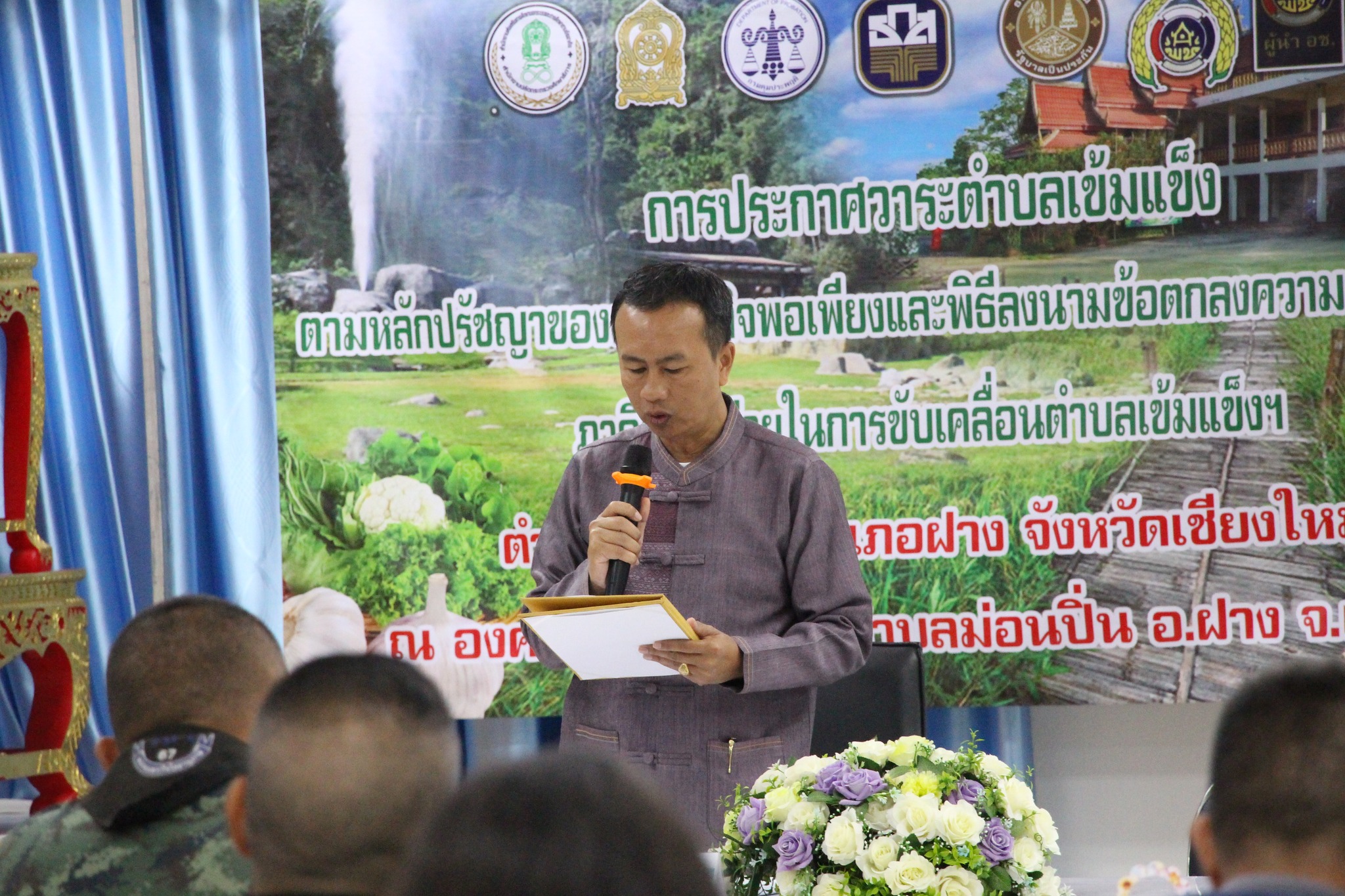ผู้นำการเปลี่ยนแปลงระดับตำบล และกลไก ๗ ภาคีเครือข่าย ในการขับเคลื่อนการดำเนินงานตำบลเข้มแข็งตามหลักปรัชญาของเศรษฐกิจพอเพียง เป้าหมายดำเนินการ ๘๗๘ ตำบล (อำเภอละ ๑ ตำบล) เพื่อส่งเสริมให้ผู้นำ กลุ่ม องค์กร ภาคีเครือข่าย และประชาชนได้เรียนรู้และน้อมนำหลักปรัชญาของเศรษฐกิจพอเพียงมาใช้ในการดำเนินชีวิต และนำมาปรับใช้ในการขับเคลื่อนตำบลเข้มแข็ง ตามหลักปรัชญาของเศรษฐกิจพอเพียง ให้มีความเข้มแข็งทั้ง ๓ มิติ (ด้านความมั่นคง ด้านความมั่งคั่ง และด้านความยั่งยืน) เพื่อเสริมสร้างขีดความสามารถในการบริหารจัดการตำบลสู่ตำบลจัดการตนเองที่มีความมั่นคง มั่งคั่ง และยั่งยืน โดยการจัดทำฐานข้อมูลชุมชนและการใช้ระบบสารสนเทศชุมชน การเชื่อมโยงภาคีเครือข่ายและการส่งเสริมให้มีระบบธรรมาภิบาลในทุกภาคส่วน และ เพื่อค้นหารูปแบบ วิธีการขับเคลื่อนตำบลเข้มแข็ง ตามหลักปรัชญาของเศรษฐกิจพอเพียงที่สามารถขยายผลการดำเนินงานได้ครอบคลุมทุกตำบล และอำเภอฝาง ได้คัดเลือกตำบลม่อนปิ่น เป็นตำบลต้นแบบในการดำเนินงานตามโครงการตำบลเข้มแข็งตามหลักปรัชญาของเศรษฐกิจพอเพียง โดยมี ว่าที่ร้อยตรีนพรัตน์ ศุภกิจโกศล นายอำเภอฝาง เป็นประธาน พร้อมด้วย ข้าราชการ กำนัน ฝ่ายปกครอง หัวหน้าฝ่าย เจ้าหน้าที่และตัวแทนจากหน่วยงานต่างๆ ณ ห้องประชุมอาคารธรรมาภิบาล ชั้น ๓  องค์การบริหารส่วนตำบลม่อนปิ่น