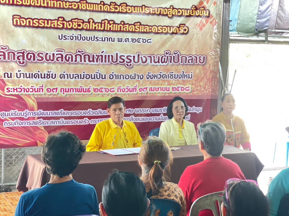 ตามโครงการพัฒนาทักษะอาชีพแก่ครัวเรือนเปราะบางสู่ความยั่งยืน กิจกรรมสร้างชีวิตใหม่ให้แก่สตรีและครอบครัว ประจำปีงบประมาณ พ.ศ.2568 (ครั้งที่ 2) ให้แก่กลุ่มสตรีและครอบครัว ในเขตพื้นที่รับผิดชอบขององค์การบริหารส่วนตำบลม่อนปิ่น โดยศูนย์เรียนรู้การพัฒนาสตรีและครอบครัวเฉลิมพระเกียรติ 72 พรรษา บรมราชินีนาถ จังหวัดลำพูน ซึ่งเป็นหน่วยงานสังกัด กรมกิจการสตรีและสถาบันครอบครัว กระทรวงการพัฒนาสังคมและความมั่นคงของมนุษย์ ณ บ้านเด่นชัยตำบลม่อนปิ่น อำเภอฝาง จังหวัดเชียงใหม่