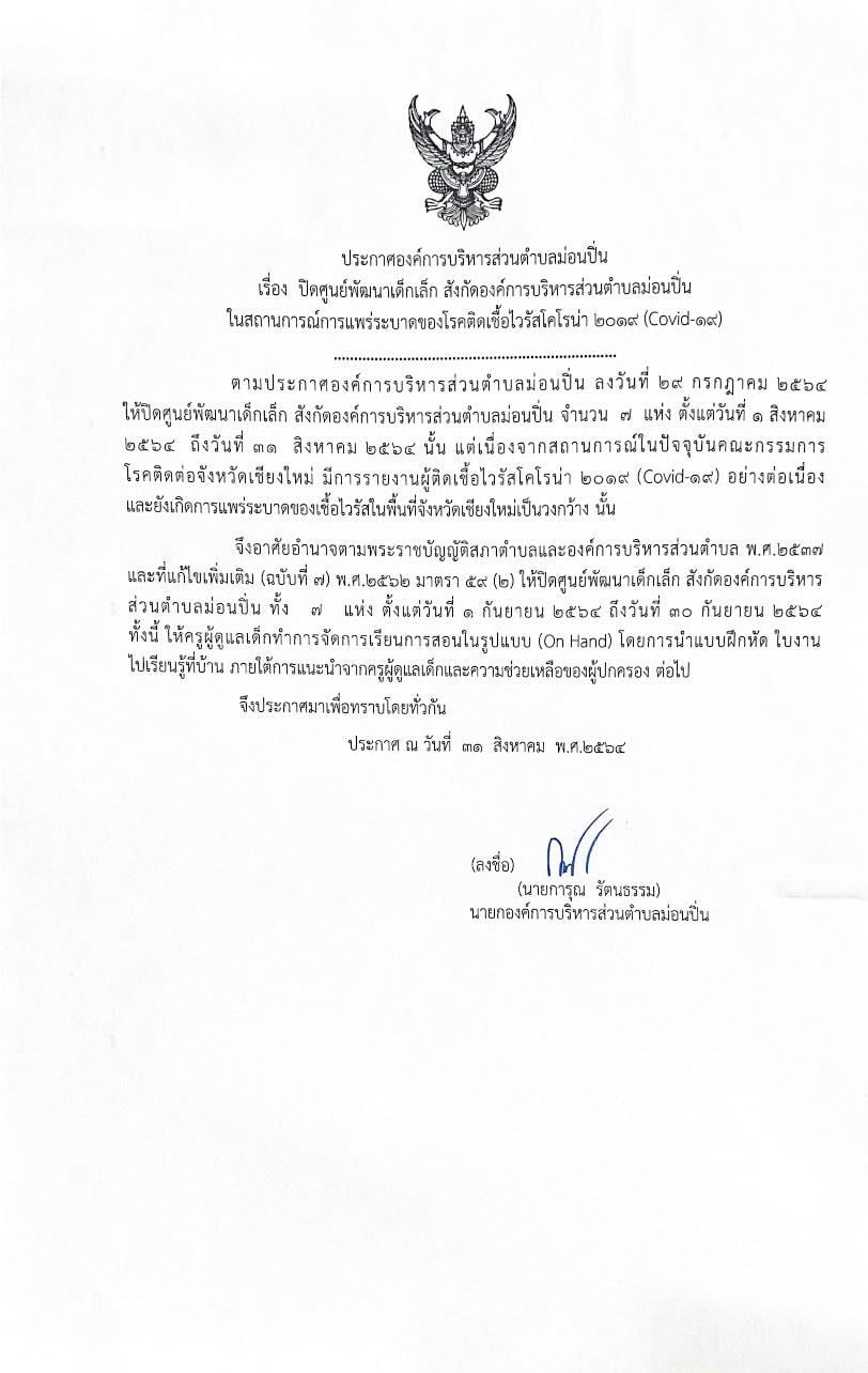 NEW ประกาศปิดศูนย์พัฒนาเด็กเล็ก สังกัดองค์การบริหารส่วนตำบลม่อนปิ่น ในสถานการณ์การแพร่ระบาดของโรคติดเชื้อไวรัสโคโรนา 2019 ประกาศองค์การบริหารส่วนตำบลม่อนปิ่น เรื่อง ปิดศูนย์พัฒนาเด็กเล็ก สังกัดองค์การบริหารส่วนตำบลม่อนปิ่น ในสถานการณ์การแพร่ระบาดของโรคติดเชื้อไวรัสโคโรนา 2019