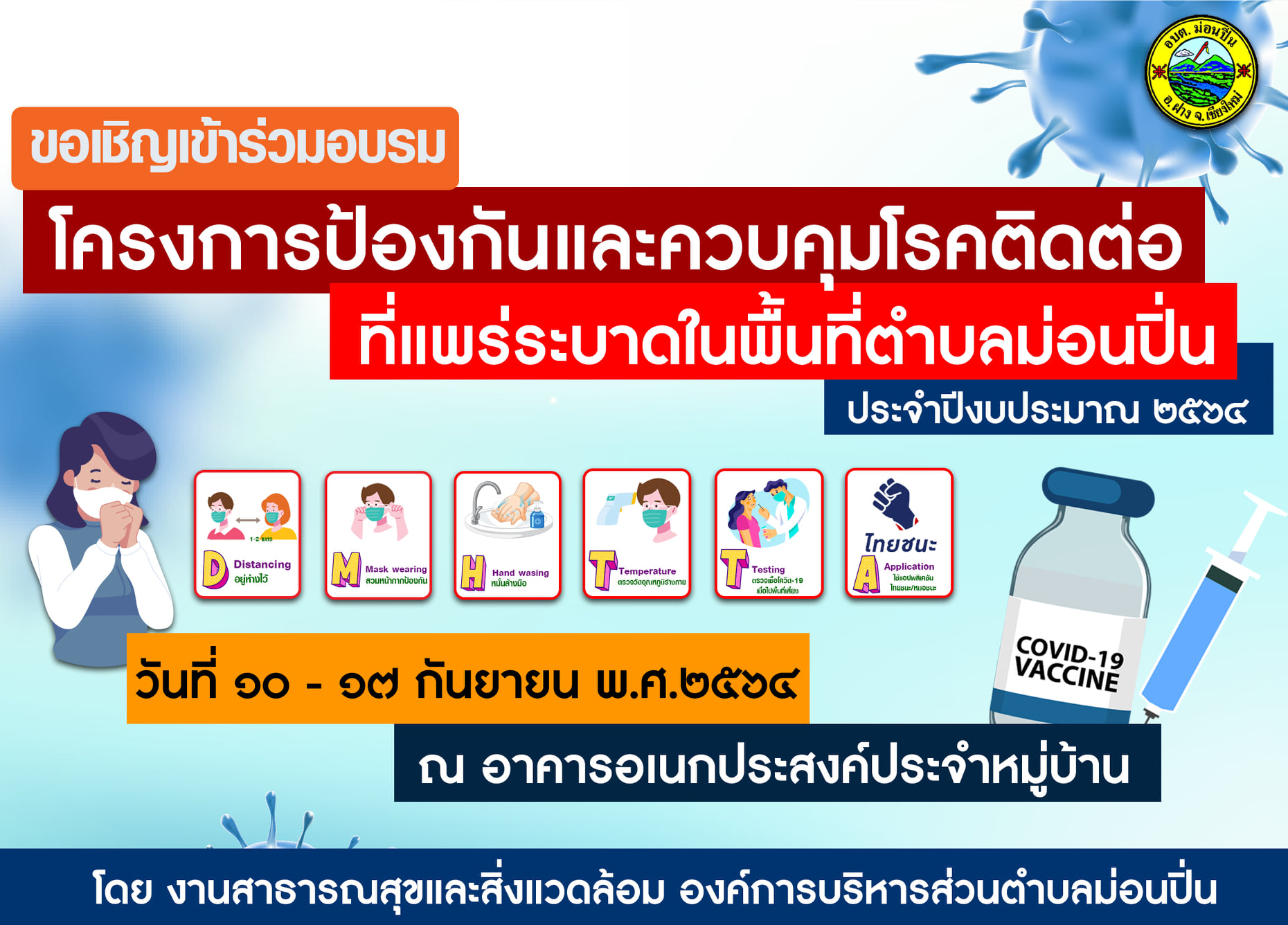 NEW เชิญชวนเข้าร่วมอบรมการป้องกันตนจากโรคติดเชื้อไวรัสโคโรน่า2019 อบต.ม่อนปิ่น ขอเชิญชวนเข้าร่วมอบรมการป้องกันตนจากโรคติดเชื้อไวรัสโคโรน่า2019 การป้องกันตนจากโรคไข้เลือดออก การป้องกันตนจากโรคชิคุนกุนย ในโครงการป้องกันและควบคุมโรคติดต่อที่แพร่ระบาดในพื้นที่ตำบลม่อนปิ่น ระหว่างวันที่ 10 - 17 กันยายน 2564 ณ อาคารอเนกประสงค์ประจำหมู่บ้าน