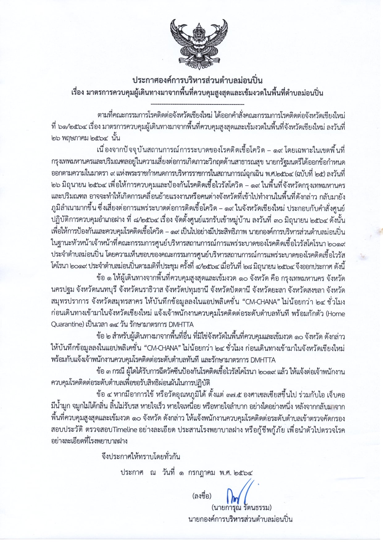 NEW มาตรการควบคุมผู้เดินทางมาจากพื้นที่ควบคุมสูงสุดและเข้มงวดในพื้นที่ตำบลม่อนปิ่น ประกาศองค์การบริหารส่วนตำบลม่อนปิ่น เรื่อง มาตรการควบคุมผู้เดินทางมาจากพื้นที่ควบคุมสูงสุดและเข้มงวดในพื้นที่ตำบลม่อนปิ่น นายการุณ รัตนธรรม นายกองค์การบริหารส่วนตำบลม่อนปิ่น หัวหน้าเจ้าหน้าที่คณะกรรมการศูนย์บริหารสถานการณ์การแพร่ระบาดของโรคติดเชื้อไวรัสโคโรนา 2019 ประจำตำบลม่อนปิ่น โดยเห็นชอบของคณะกรรมการศูนย์ฯ มีมติที่ประชุม ครั้งที่ 4/2564 เมื่อวันที่ 28 มิถุนายน 2564