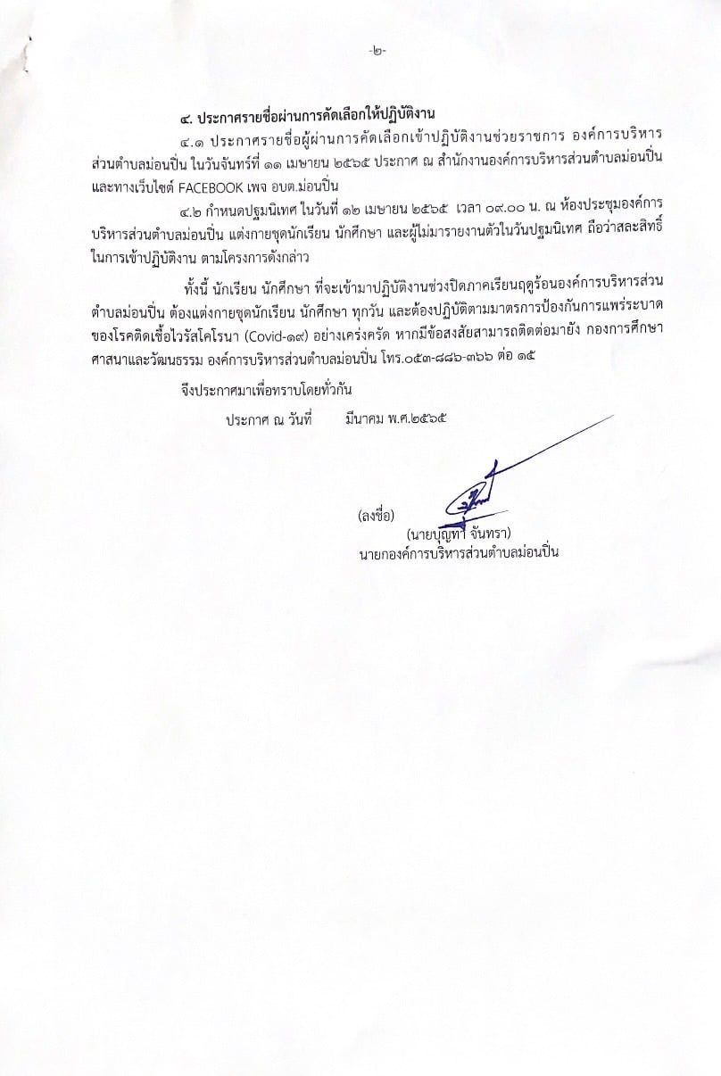 NEW ประกาศรายชื่อนักเรียน นักศึกษา ทำงานช่วงปิดเทอมฤดูร้อน ประจำปีงบประมาณ 2565 ประกาศรายชื่อนักเรียน นักศึกษา ทำงานช่วงปิดเทอมฤดูร้อน ประจำปีงบประมาณ 2565 โดยให้ผู้ที่มีรายชื่อดังต่อไปนี้เข้ารับการปฐมนิเทศ ในวันอังคารที่ 12 เมษายน 2565 เวลา 09.00 น. ณ องค์การบริหารส่วนตำบลม่อนปิ่น