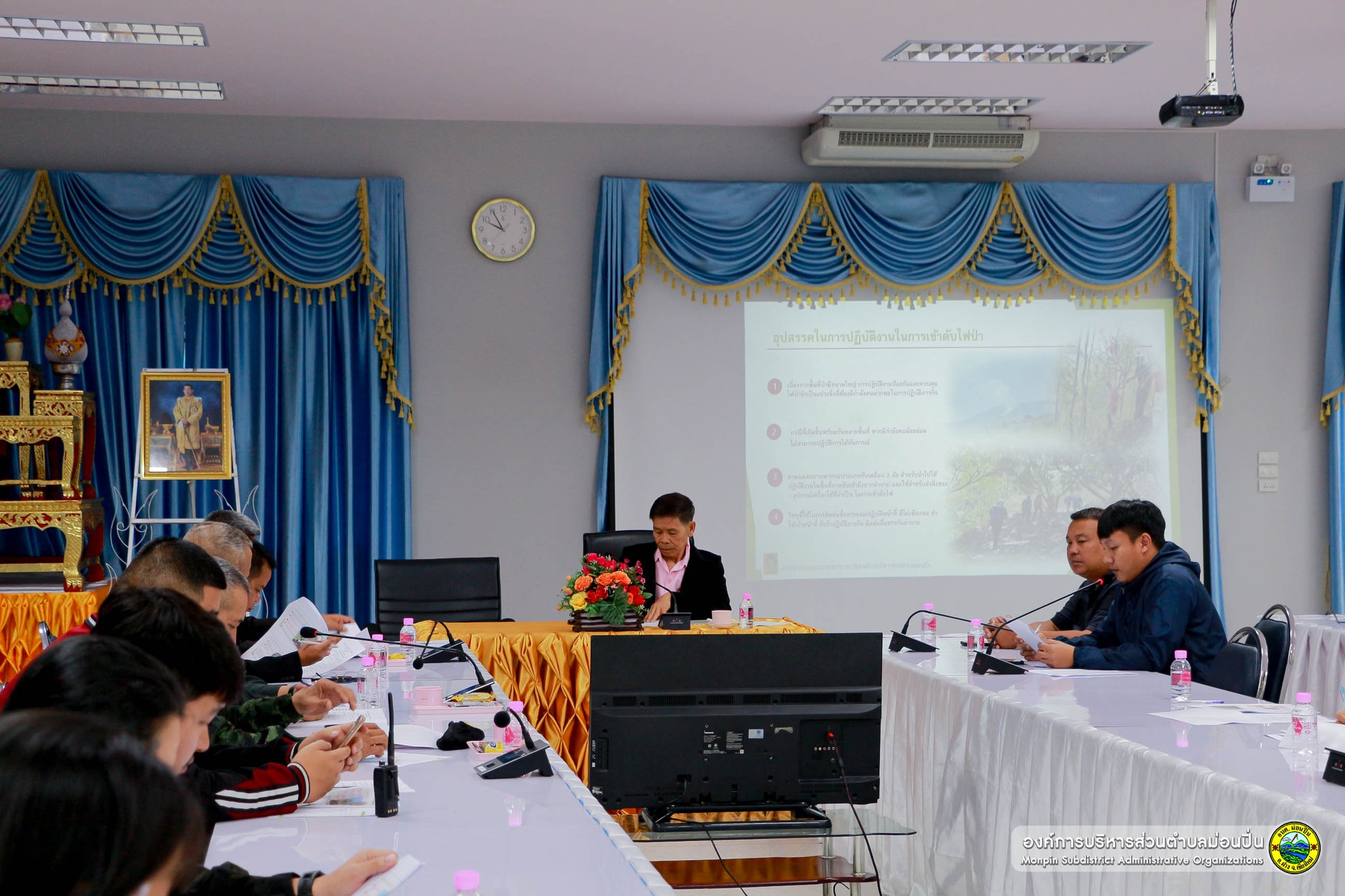 โดยมี นายบุญทา จันทรา นายกองค์การบริหารส่วนตำบลม่อนปิ่น นางอารีย์ สุริยะ รองนายกฯ นายธนาคาร คำน้อย เลขานุการนายกฯ นายณัฏฐพล รินแก้ว ประธานสภา นายเอกภาค จันทรา รองประธานสภา นายพิจิตร บัวผัน เลขานุการสภา พร้อมด้วยสมาชิสภาฯ หัวหน้าส่วนราชการฯ เข้าร่วมประชุม ณ ห้องประชุมสภาองค์การบริหารส่วนตำบลม่อนปิ่น