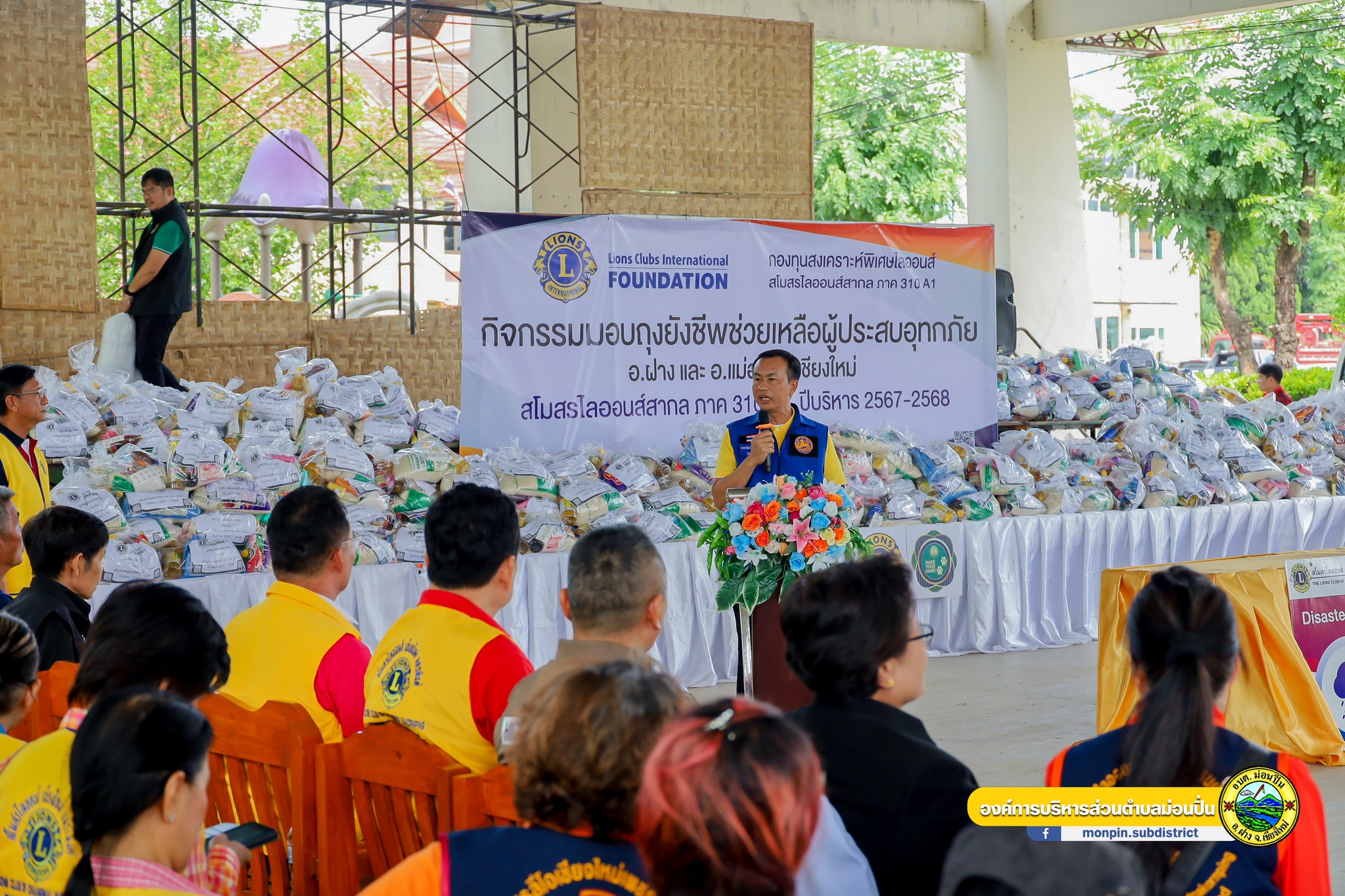 สโมสร ไลออนส์ สากล ภาค 310 A1 มอบถุงยังชีพ จำนวน 500 ชุด ให้กับผู้ประสบอุทกภัย พื้นที่ ต.ม่อนปิ่น อ.ฝาง จ.เชียงใหม่ โดยมี ว่าที่ร้อยตรีนพรัตน์ ศุภกิจโกศล นายอำเภอฝาง พร้อมด้วยนายบุญทา จันทรา นายกองค์การบริหารส่วนตำบม่อนปิ่น นายศตวรรษ อภิวงค์ ปลัดอำเภอ นายสรพงศ์ เตละวานิช ปลัดอำเภอ นายสุรินทร์ ศรีวรรณตัน กำนันตำบลม่อนปิ่น กิ่งกาชาดอำเภอฝาง แม่บ้านมหาดไทย ร่วมต้อนรับคณะพร้อมทั้งพูดคุยสร้างขวัญกำลังใจแก่ผู้ประสบภัย ณ องค์การบริหารส่วนตำบลม่อนปิ่น
