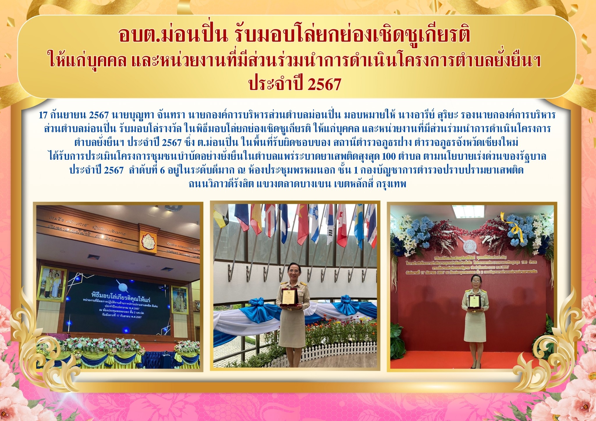 17 กันยายน 2567 นายบุญทา จันทรา นายกองค์การบริหารส่วนตำบลม่อนปิ่น มอบหมายให้ นางอารีย์ สุริยะ รองนายกองค์การบริหารส่วนตำบลม่อนปิ่น รับมอบโล่ยกย่องเชิดชูเกียรติ ในพิธีรับมอบโล่ยกย่องเชิดชูเกียรติ ให้แก่บุคคล และหน่วยงานที่มีส่วนร่วมนำการดำเนินโครงการตำบลยั่งยืนฯ ประจำปี 2567 ซึ่ง ต.ม่อนปิ่น ในพื้นที่รับผิดชอบของ สถานีตำรวจภูธรฝาง ตำรวจภูธรจังหวัดเชียงใหม่ ได้รับการประเมินโครงการชุมชนบำบัดอย่างยั่งยืนในตำบลแพร่ระบาดยาเสพติดสุงสุด 100 ตำบล ตามนโยบายเร่งด่วนของรัฐบาล ประจำปี 2567 ลำดับที่ 6 อยู่ในระดับดีมาก ณ ห้องประชุมพรหมนอก ชั้น 1 กองบัญชาการตำรวจปราบปรามยาเสพติด ถนนวิภาวดีรังสิต แขวงตลาดบางเขน เขตหลักสี่ กรุงเทพ