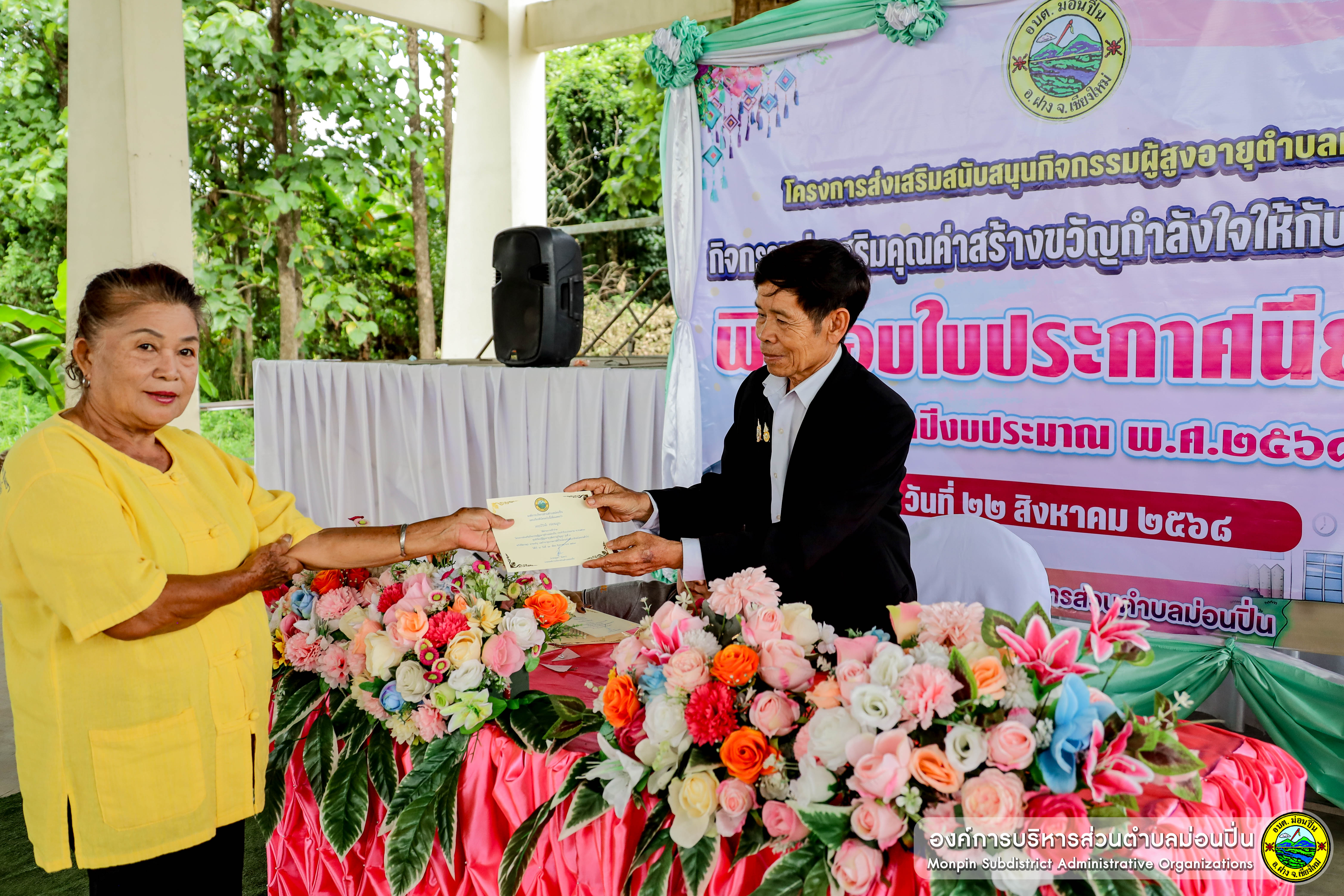 และพิธีมอบใบประกาศนียบัตรให้แก่นักเรียนผู้สูงอายุวุฒิสราญปัญญา รุ่นที่ 4 โดยมี นายบุญทา จันทรา นายก อบต.ม่อนปิ่นเป็นประธาน ฯ พร้อมด้วยคณะผู้บริหาร สมาชิกสภาฯ ร่วมกิจกรรม ณ อาคารอเนกประสงค์ องค์การบริหารส่วนตำบลม่อนปิ่น