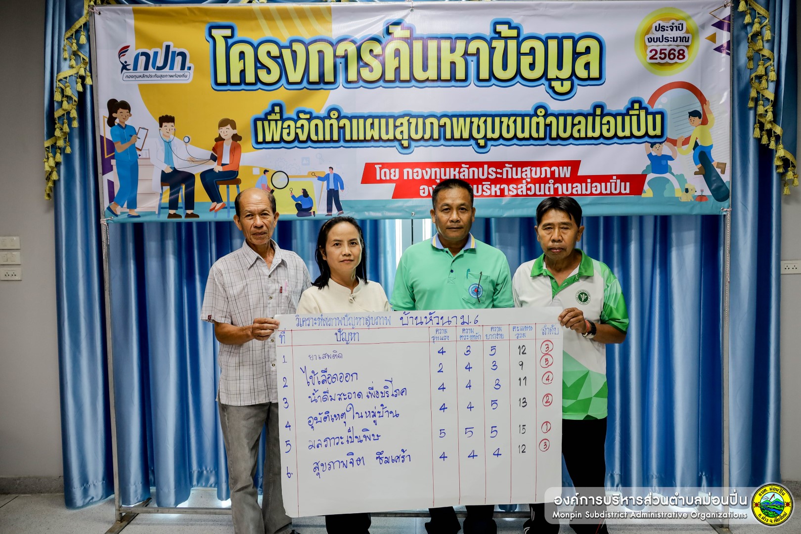 กองทุนหลักประกันสุขภาพองค์การบริหารส่วนตำบลม่อนปิ่น จัดโครงการค้นหาข้อมูลเพื่อจัดทำแผนสุขภาพชุมชนตำบลม่อนปิ่นประจำปีงบประมาณ 2568 เพื่อให้ทุกภาคส่วนมีส่วนร่วมในการจัดทำแผนสุขภาพชุมชนเพื่อนำมาใช้เป็นเครื่องมือในการบริหารจัดการกองทุนหลักประกันสุขภาพ อบต.ม่อนปิ่น กำหนดแนวทางการพัฒนาสุขภาพของประชาชนในพื้นที่ เพื่อนำมาใช้เป็นแนวทางในการแก้ไขปัญหาและกำหนดทิศทางการดำเนินงานในการสนับสนุนงบประมาณให้แก่หน่วยบริการสุขภาพประชาชน และภาคีที่เกี่ยวข้อง เพื่อจัดทำแผนสุขภาพส่งเสริมให้ประชาชนได้รับบริการสาธารณสุขที่มีคุณภาพอย่างต่อเนื่องที่ดีขึ้น