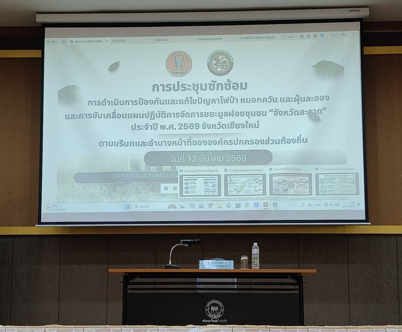 นางไพรพนา ศรีวรรณตัน นายกอบต.ม่อนปิ่น ร่วมประชุมซักซ้อมการดำเนินการป้องกันและแก้ไขปัญหาไฟป่า หมอกควัน และฝุ่นละออง และการขับเคลื่อนแผนปฏิบัติการจัดการขยะมูลฝอยชุมชน "จังหวัดสะอาด" ประจำปี พ.ศ. 2569 จังหวัดเชียงใหม่ ตามบริบทและอำนาจหน้าที่ขององค์กรปกครองส่วนท้องถิ่น เพื่อขับเคลื่อนการดำเนินการป้องกันและแก้ไขปัญหาไฟป่า หมอกควันและฝุ่นละออง และขับเคลื่อนแผนปฏิบัติการจัดการขยะมูลฝอยชุมชน "จังหวัดสะอาด" ประจำปีงบประมาณ พ.ศ.2569 ของจังหวัดเชียงใหม่ ณ หอประชุมศาลาสหกิจ เทศบาลตำบลท่าศาลา อำเภอเมืองเชียงใหม่ จังหวัดเชียงใหม่